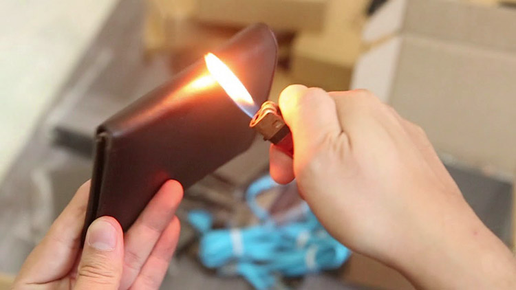 Với những sản phẩm bằng da giả, khi bị đốt chúng thường có mùi da bị cháy xém có mùi khét, tóc cháy trong khi những sản phẩm được làm bằng da giả, chúng thường bị vón cục khi cháy.4. Làm ướt sản phẩm