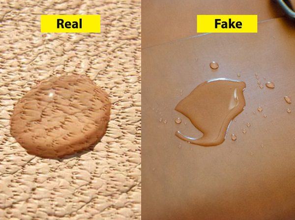Khi nhỏ một vài giọt nước vào da thật, sau một vài phút, chỗ nước đó sẽ bị lan rộng và thấm vào da do da thật luôn hấp thụ độ ẩm trong khi da giả do không thấm nước nên nước thường trượt khỏi bề mặt