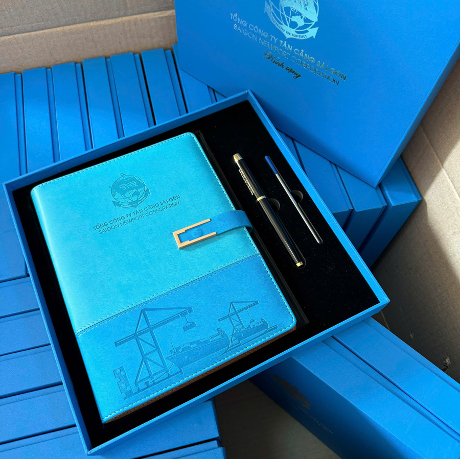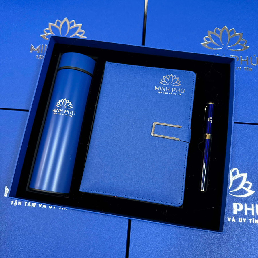 Một bộ set quà cao cấp gồm sổ da, bút ký, bình giữ nhiệt, ô dù hoặc các sản phẩm mix theo chủ đề sẽ thể hiện sự đầu tư chỉn chu và trọn vẹn. Với bao bì hộp sang trọng, phối màu tinh tế, set quà tặng này tạo ấn tượng mạnh về hình ảnh thương hiệu ngay từ cái nhìn đầu tiên. Đây là lựa chọn lý tưởng cho các dịp kỷ niệm quan trọng hoặc tặng VIP đối tác lớn.