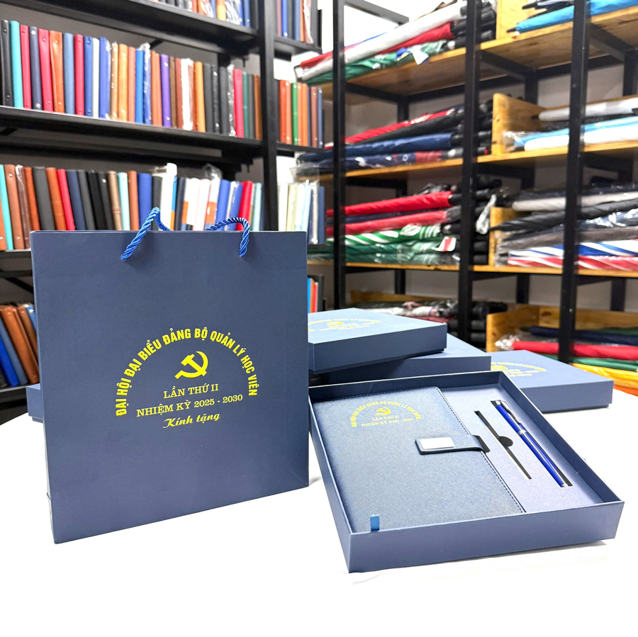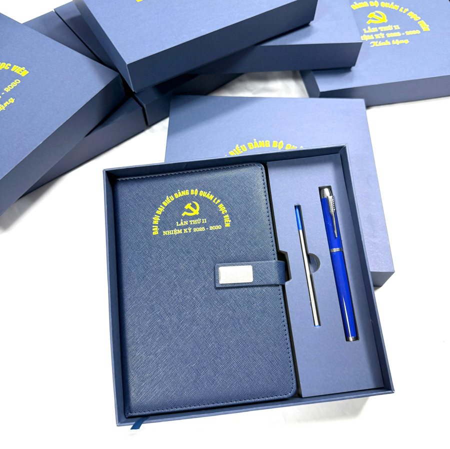 Sổ da là thành phần quan trọng trong bộ quà tặng này. Sổ da được làm từ chất liệu da thật hoặc da tổng hợp cao cấp, mang đến sự sang trọng, bền bỉ và cảm giác mềm mại khi cầm. Sổ có thể có nhiều kích thước khác nhau, từ sổ nhỏ gọn để dễ dàng mang theo trong túi xách đến những chiếc sổ lớn hơn, tiện dụng cho việc ghi chép trong các cuộc họp hoặc hội nghị quan trọng.