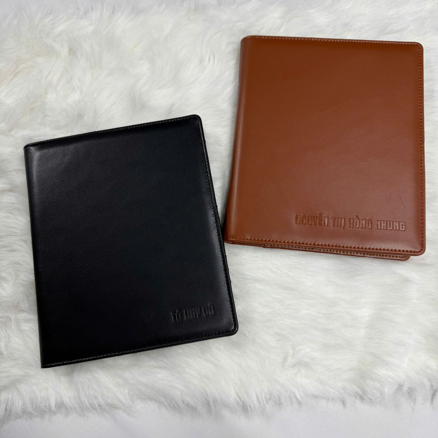 Sổ da cao cấp thường sử dụng chất liệu da PU hoặc da thật, bìa mềm, có thể ép kim, dập chìm hoặc in màu logo thương hiệu trên mặt bìa. Nhiều mẫu còn tích hợp dây cài, túi đựng danh thiếp, hoặc chia sẵn các phần mục lục tiện lợi. Chính tính linh hoạt trong thiết kế và khả năng tùy biến theo yêu cầu thương hiệu đã giúp sản phẩm này trở thành lựa chọn lý tưởng để tạo sự đồng bộ trong các dịp quan trọng.