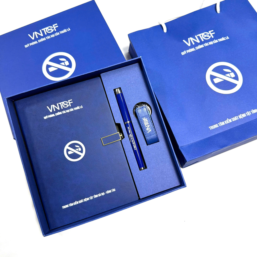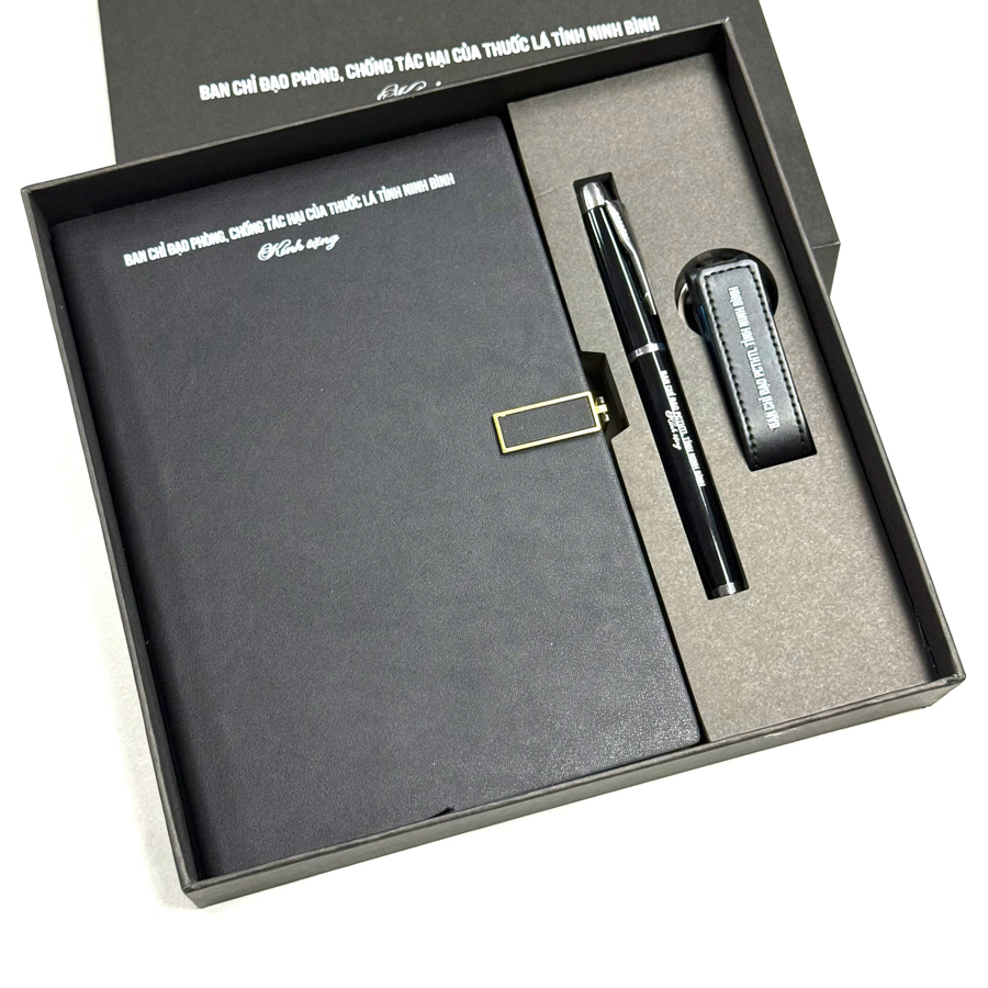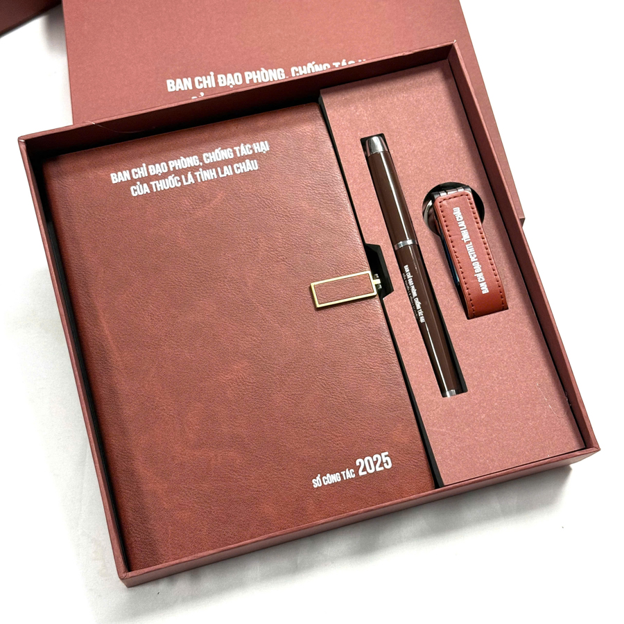 Đây là set quà tặng đơn giản nhưng mang lại hiệu quả tối đa. Sổ da được in logo ở ngoài bìa, còn bút ký có thể được khắc tên thương hiệu hoặc slogan. Tưởng chừng như giản đơn, nhưng bộ đôi sổ – bút lại là cặp bài trùng cực kỳ lý tưởng. Sổ da dành để ghi chép, trong khi bút ký giúp ghi lại những khoảnh khắc quan trọng – từ ký kết hợp đồng đến viết nhật ký hành trình. Cả hai bổ trợ cho nhau tạo nên sự đồng bộ trong trải nghiệm của người nhận.