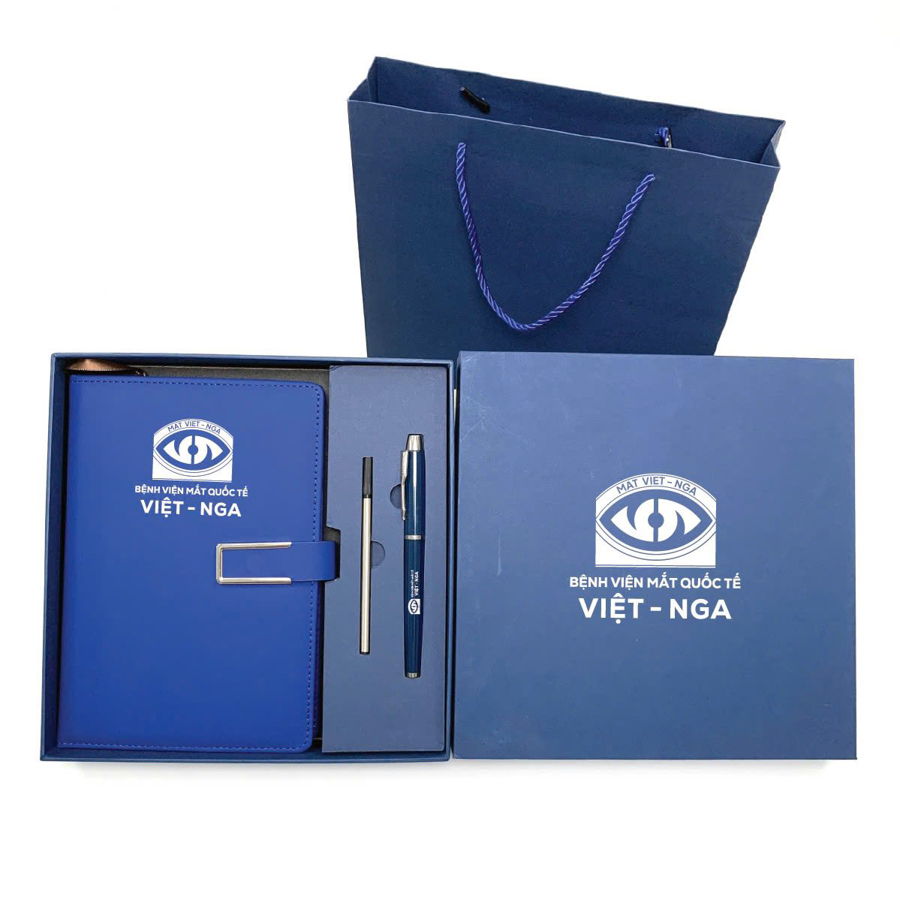Khi doanh nghiệp muốn nâng tầm quà tặng lên thành một món quà chỉn chu và có giá trị thẩm mỹ cao, việc bổ sung một chiếc hộp đựng được thiết kế riêng sẽ tạo nên điểm nhấn ấn tượng. Hộp có thể làm từ giấy cứng, da nhân tạo, hoặc gỗ ép, bên ngoài in hoặc dập nổi logo doanh nghiệp. Khi mở ra, bên trong là sổ da đặt gọn gàng bên cạnh cây bút, đôi khi được lót thêm lớp nhung hoặc mousse để tăng phần sang trọng. Đây là lựa chọn lý tưởng khi bạn cần tặng cho đối tác quan trọng, khách VIP hoặc trong các dịp lễ kỷ niệm lớn.