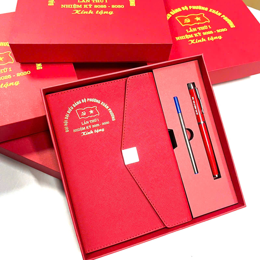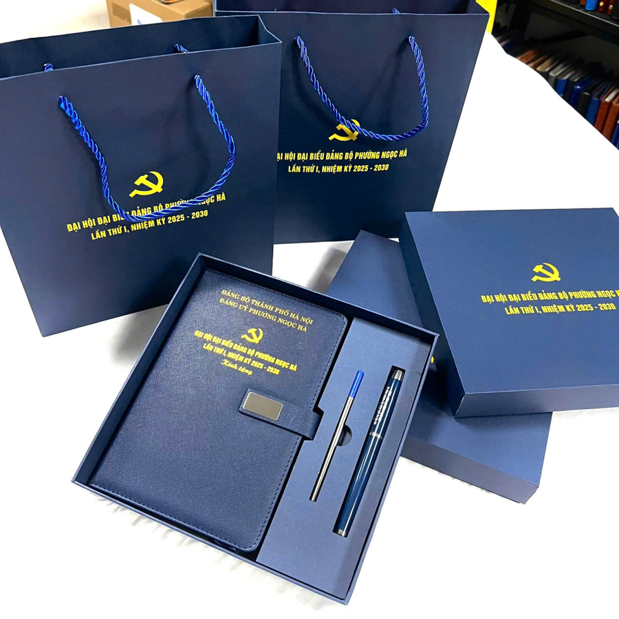 Các set quà này có thể được đóng trong hộp cao cấp, lót nhung hoặc mút định hình, mang lại cảm giác sang trọng khi mở quà. Một bộ quà tặng gồm sổ da – bút ký – bình giữ nhiệt in logo không chỉ mang tính thực tế mà còn thể hiện hình ảnh doanh nghiệp chỉn chu, tinh tế và đầy chuyên nghiệp.