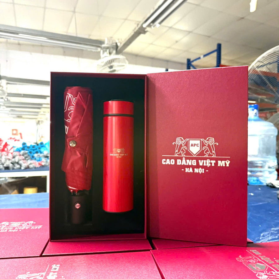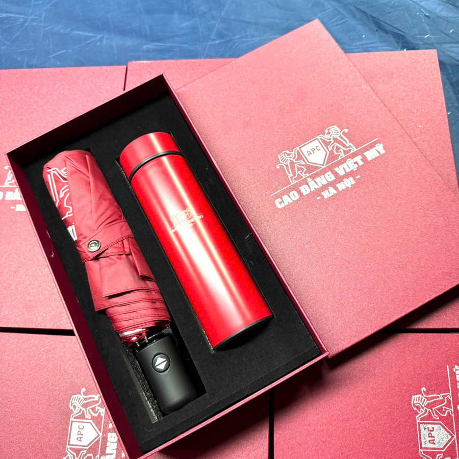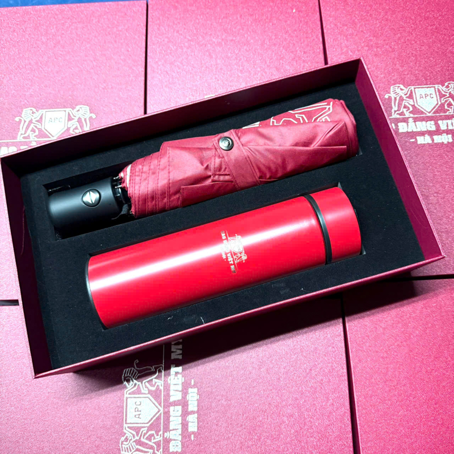 Nếu bộ sổ – bút – cốc giữ nhiệt đại diện cho sự chuyên nghiệp, thì bộ bình giữ nhiệt và ô dù lại là biểu tượng của sự đồng hành và bảo vệ. Hai món quà này mang tính ứng dụng cực cao, có thể sử dụng suốt bốn mùa và phù hợp cho cả nam lẫn nữ, nhân viên lẫn khách hàng, người trẻ lẫn người lớn tuổi.